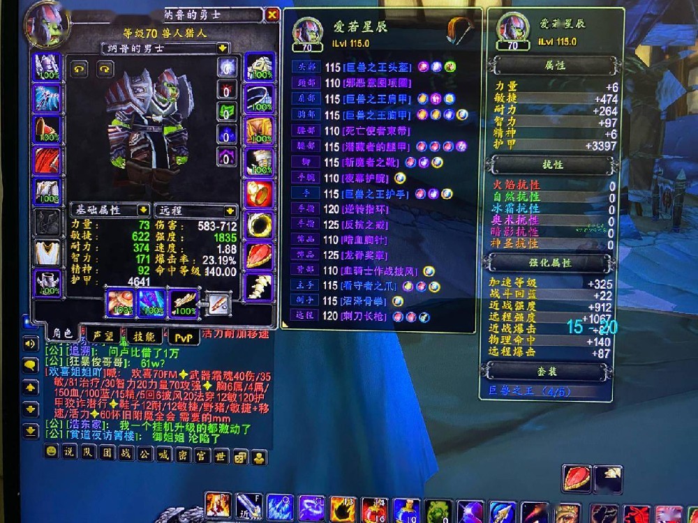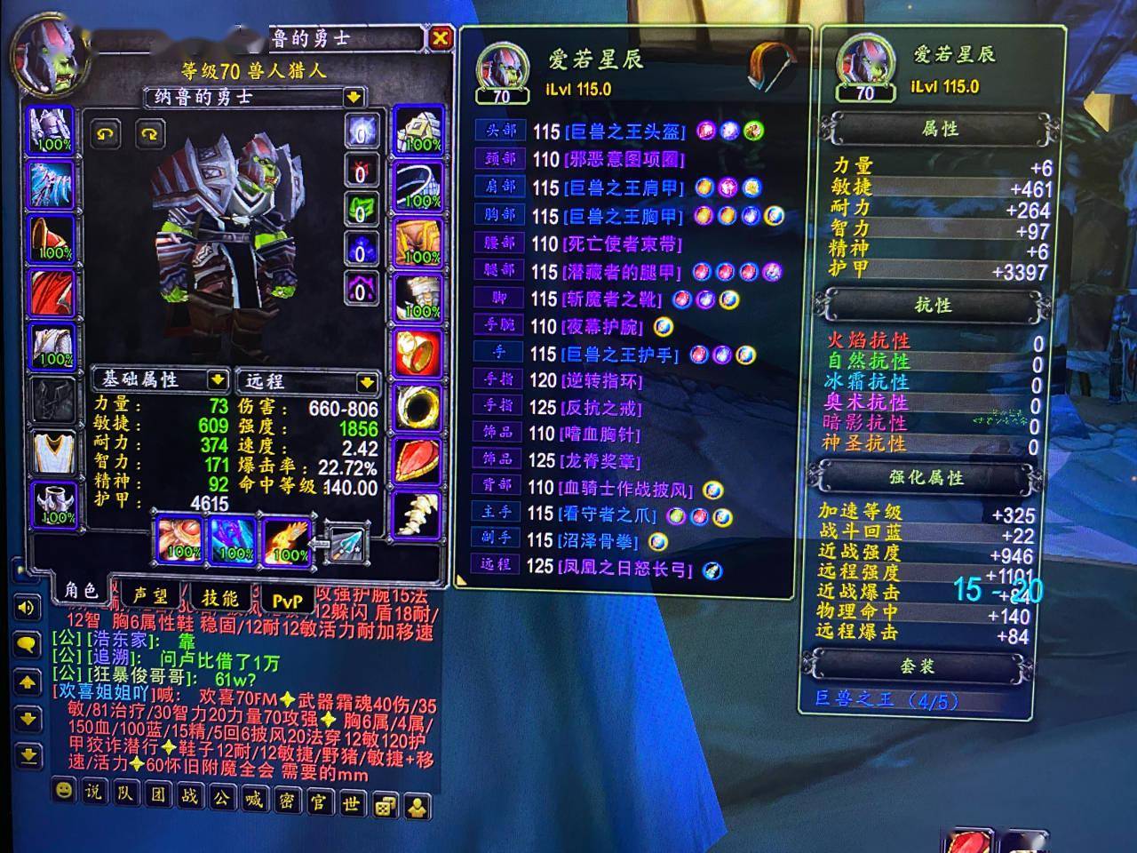 有一把刺刀长枪,是从世界BOSS末日机甲那儿获取的,在7月27日的时候,花了12500G才拿到。还有两把武器,它们各有优点。这两把武器都附上了28暴击之后,再开启雄鹰守护,其属性就像下面图里显示的那样,两者相差并不多。凤凰弓的外观比较好看,特别是对于巨魔种族来说,使用它还能有1%暴击的优势。不过,世界BOSS出的那把枪,它的属性看起来似乎更棒一些,而且释放技能时发出的声音也非常悦耳。