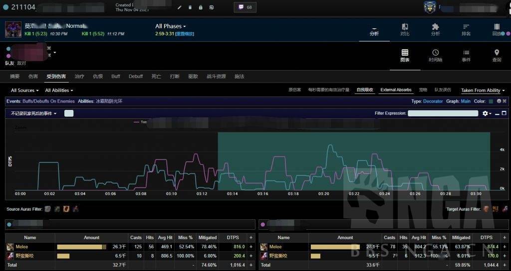 某一波怪的承伤情况,我们可以通过本周站撸(左边数据)和上周陷阱风筝(右边数据)的实时数据来对比。