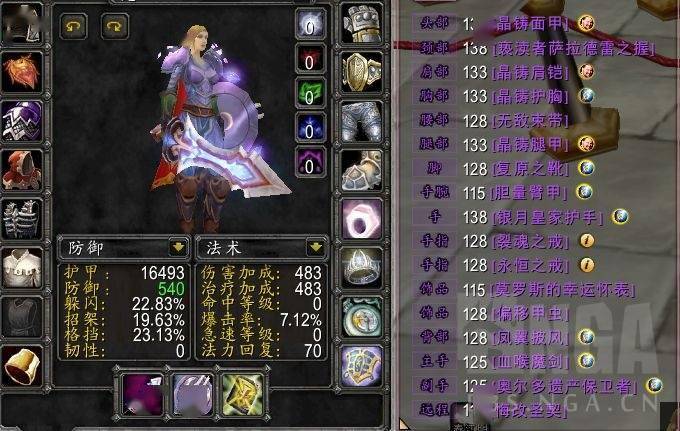 没有增益效果(BUFF)的时候,血量是13977,护甲达到16493,格挡值为569,法伤有483。把未命中这个因素排除掉,开启神盾之后,各项防御属性的综合数值(三围)是100.91。要是算上增益效果的话,这个三围就能够免疫剪切伤害了。在这种情况下,甚至都能把怀表这个饰品换掉,换成增加血量的酒杯饰品,或者换上增加仇恨的法伤饰品。