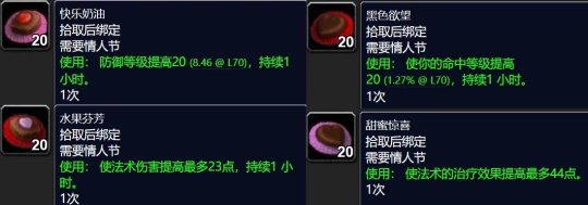 TBC怀旧服的情人节没有坐骑和装备,但情人节巧克力对玩家来说仍有收集的价值。情人节巧克力有四种,其效果各有不同。一种能提高23点法伤,一种可增加44点治疗量,还有一种能提升20点命中等级,最后一种可提升20点防御等级,这些效果能持续1个小时,并且可以和药剂、合剂的效果叠加。情人节巧克力的属性收益跟2块史诗宝石差不多,想让自己角色更强的玩家可不能错过它。在60级版本,情人节巧克力的保质期是10天,不过只计算在线时间。像那些冲榜竞速团的玩家,有时候能放3个月甚至半年。TBC怀旧服的情人节巧克力保质期好像也只计算在线时间,不过这还得等玩家去测试才能确定。