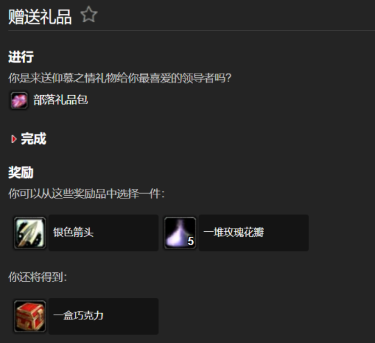 情人节的巧克力是从巧克力盒子里开出来的,数量和种类都随机。要重复得到巧克力盒子有两种办法。一种办法是反复刷【赠送礼品】任务,这任务可麻烦了。玩家得和各大主城的NPC互动,拿到三种谢礼,然后把每种谢礼先凑成谢礼集,再把三个谢礼集弄成主城礼包,最后把三个主城礼包合成阵营礼品包,上交这个阵营礼品包才能得到一盒巧克力,这流程实在繁琐。所以呢,小编更倾向于另一种刷巧克力的方法,这种方法更简单高效。在主城的节日NPC那儿买香水来用,之后就可以拿着爱情信物去向NPC告白,要是告白成功了就能拿到一份【爱慕的信物】,打开这个【爱慕的信物】就有机会得到巧克力盒子。不过呢,告白成功会有个1小时1次的负面效果(DEBUFF),这时候可以建1级小号来无限刷。另外,还有一种利用漏洞(BUG)的刷法,这是NGA用户CN_千阳丶在去年60级怀旧服情人节的时候发现的。就是在主城找两个距离近的卫兵,像暴风城监狱门口有一男一女两个卫兵就可以。