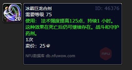 等级需求:75。使用后法术强度零增长,且这一效果会持续1个小时,哪怕死亡了,这个效果也不会消失。这是一种战斗和守护都能用的药剂。