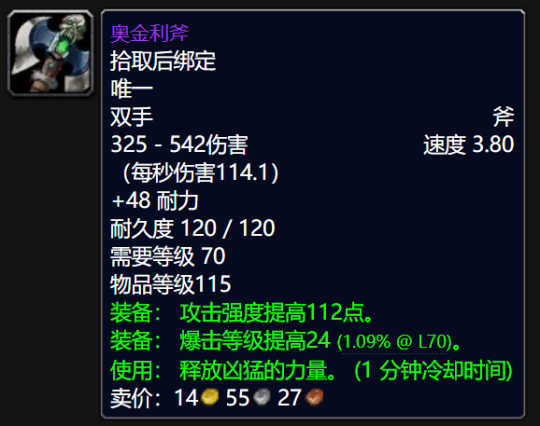 奥金利斧是一把双手斧,它的等级为115级。这把斧子整体的属性一点都不吸引人。不过呢,它有个特别帅气的使用效果,那就是“释放凶猛的力量”。